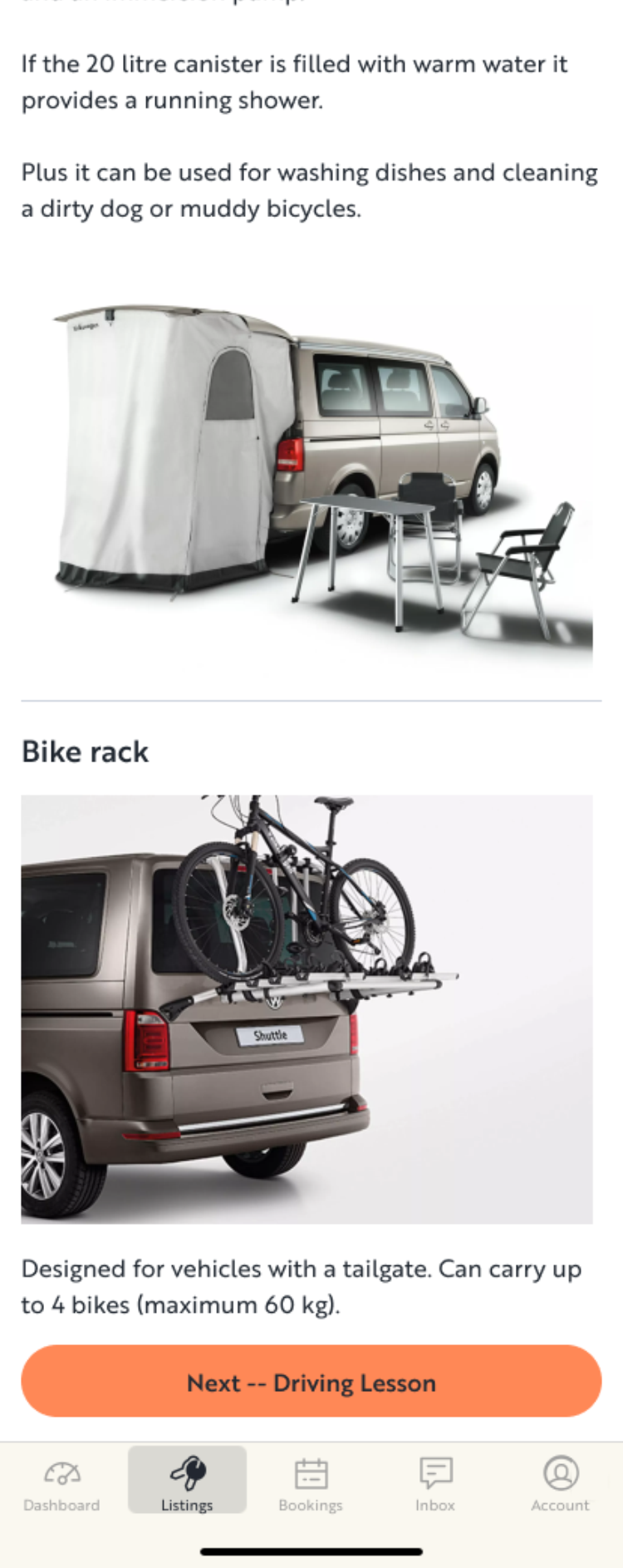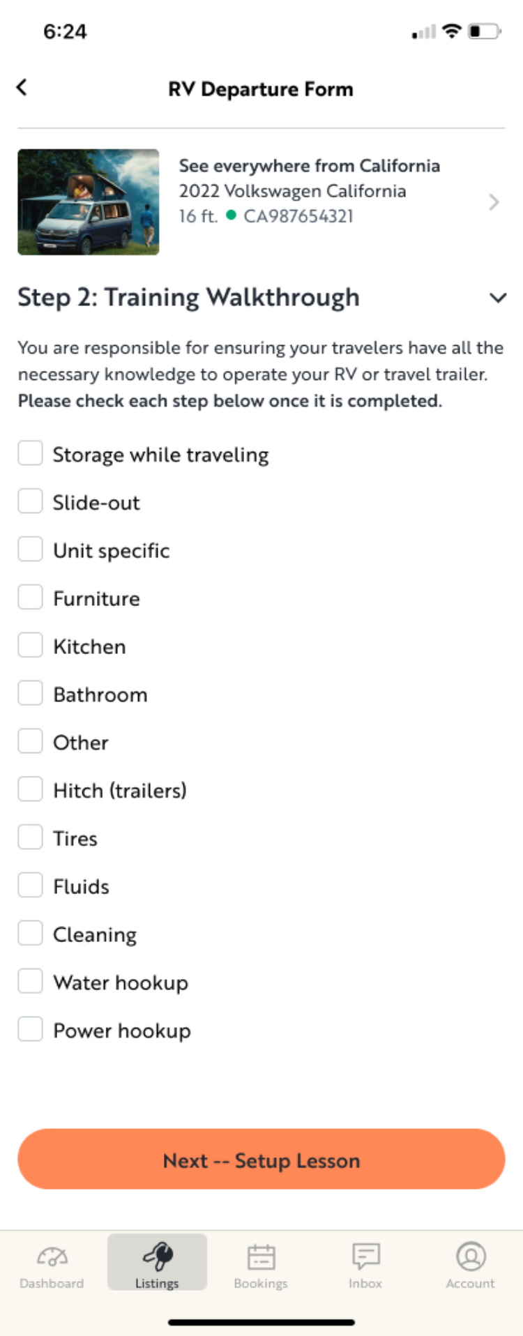 Step 2 of the in-person handoff with the renter consists of a detailed on-site training walkthrough of operation of the vehicle, where the owner is “responsible for ensuring your travelers have all the necessary knowledge to operate your RV […]”.