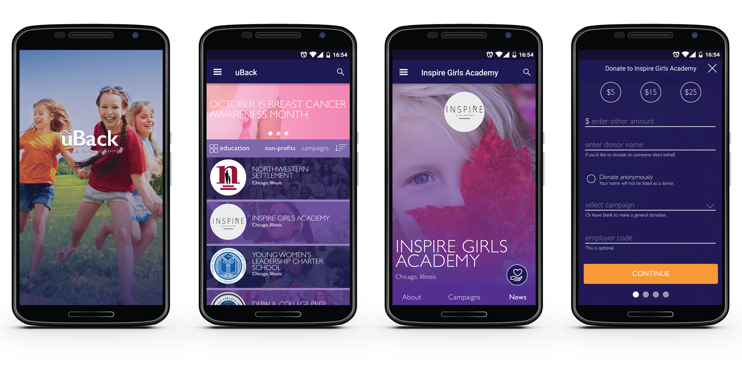 All that cause-based imagery, however dynamic, can verge on verisimilitude. So the nonprofit and campaign listings make clear use of nonprofit logos for easier user recognition and app navigation. And most importantly, the donation flow strives for simplicity, limiting the screen number to four (for uBack donor account holders).