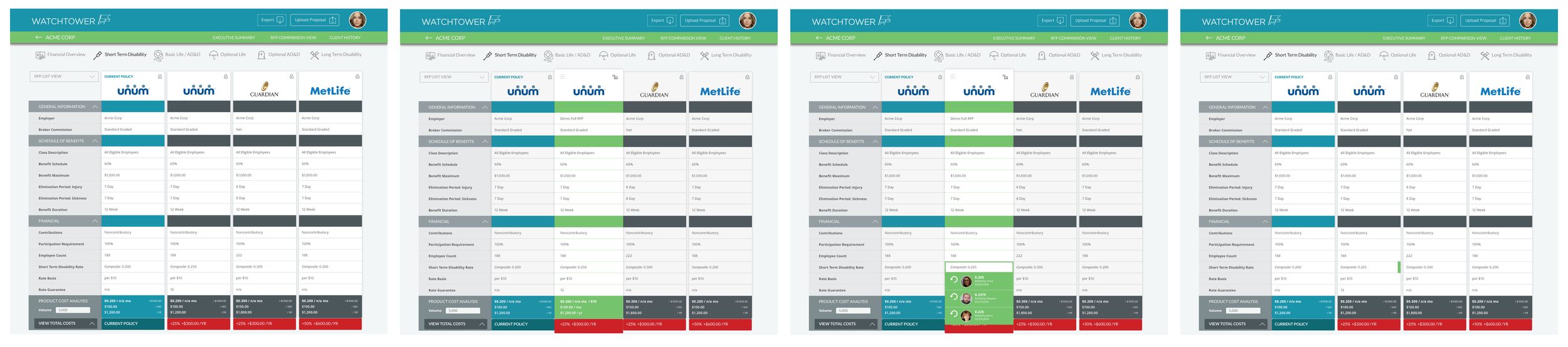 Working from the recently completed annotated wireframes, my final high fidelity designs leverage the tile design pattern and a bright, friendly color palette. The user (insurance brokers) will often need to access data from up to 12 different RFPs, necessitating working with a pair of conventional desktop monitors.